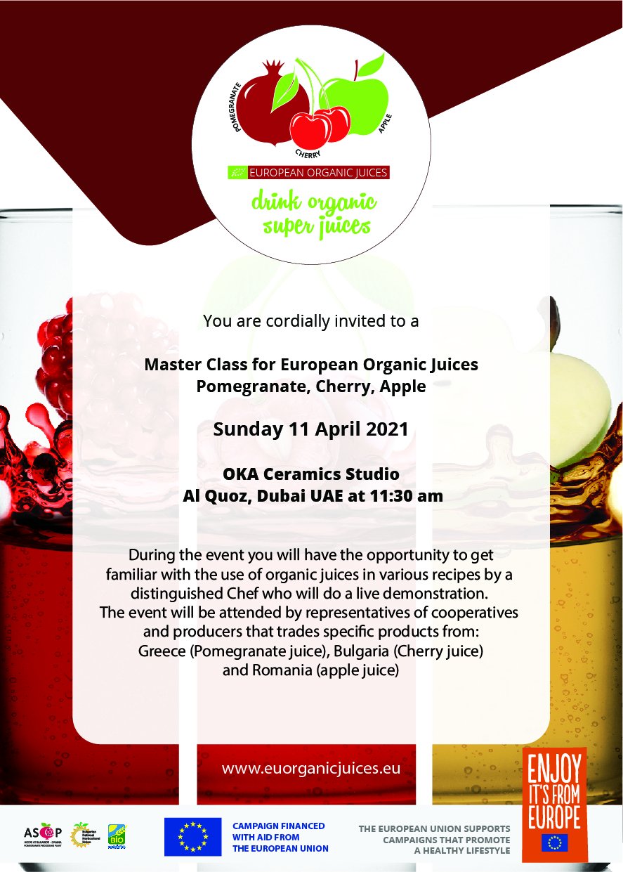 A Product Presentation Event for the promotion of European Organic juices took place on the 11th April 2021, at OKA Ceramics Studio in Al Quoz, Dubai, through the EU campaign “European Organic Juices”.